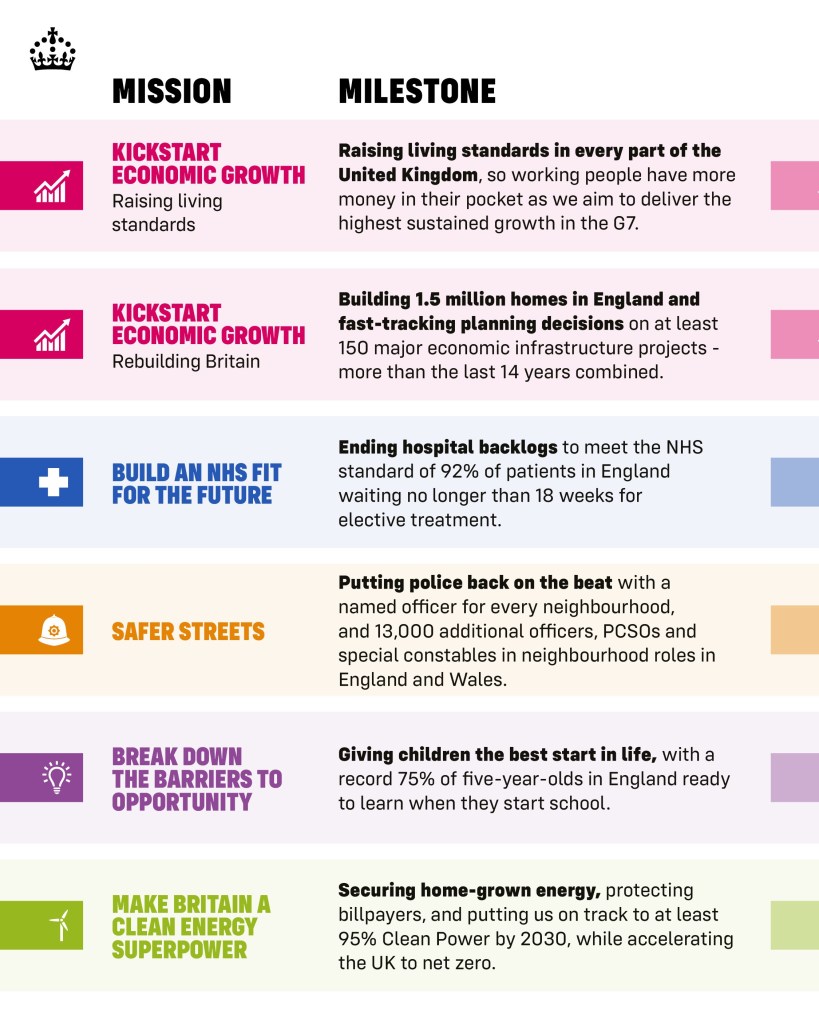 The Plan for Change consists of six clear milestones – covering housebuilding, the economy, the NHS, clean power, education and crime – to deliver measurable change by the end of this parliament. The plan is underpinned by foundations of sound public finances and secure borders.